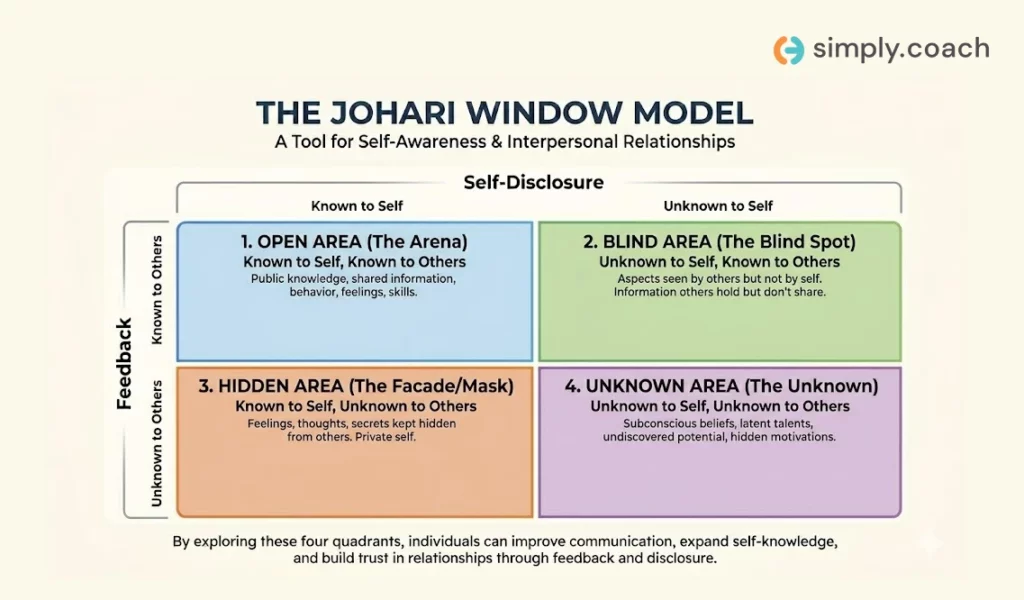 | Johari Window | Open, Blind, Hidden, Unknown | Self-awareness, team dynamics, leadership development | Reveals blind spots and hidden potential, fosters trust and feedback culture, practical for one-on-one or group coaching | Requires psychological safety and honest feedback; less effective in crisis or highly defensive contexts |