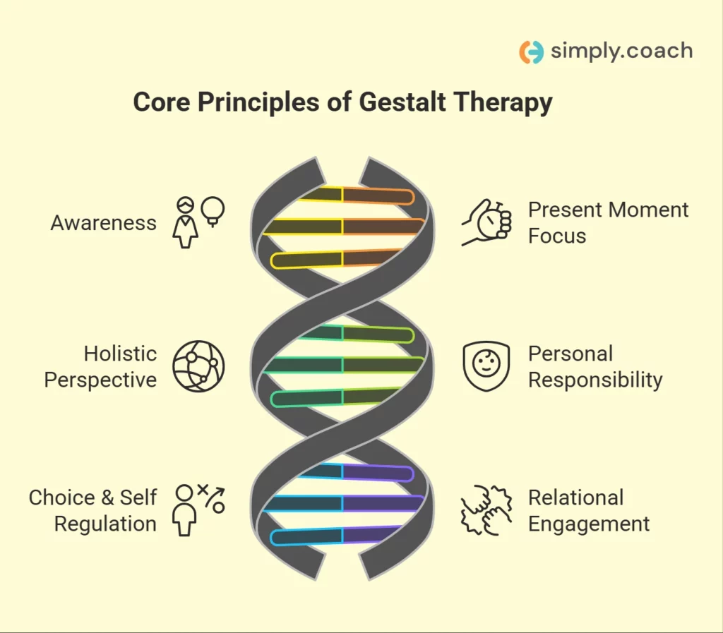 As a therapist practicing Gestalt Therapy, these core principles guide how you observe clients, structure interventions, and facilitate insight. Together, they shape a therapeutic approach that prioritizes awareness, experiential learning, and authentic contact within the session.