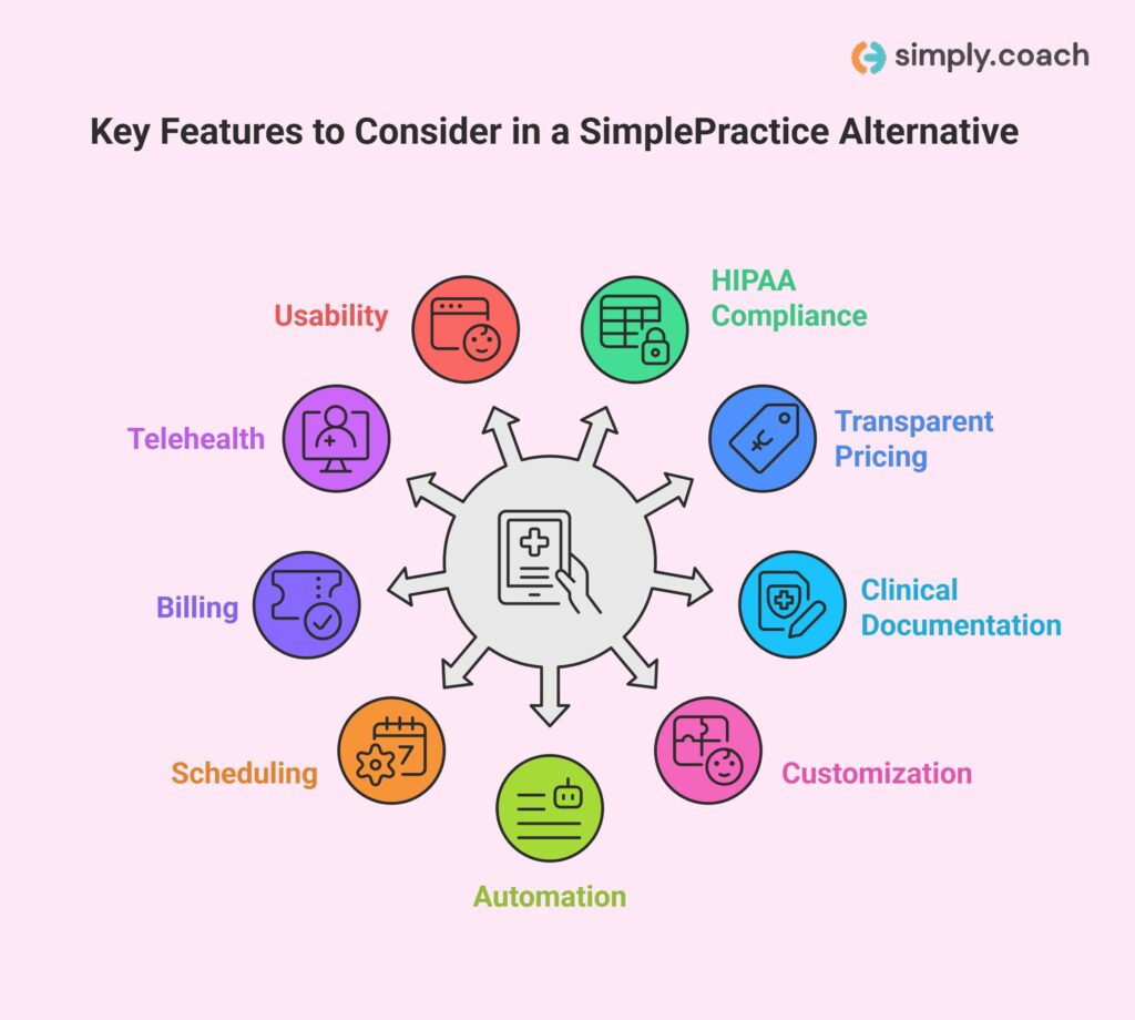 When comparing SimplePractice alternatives, focus on features that directly impact clinical documentation, compliance, client experience, and day-to-day practice efficiency.