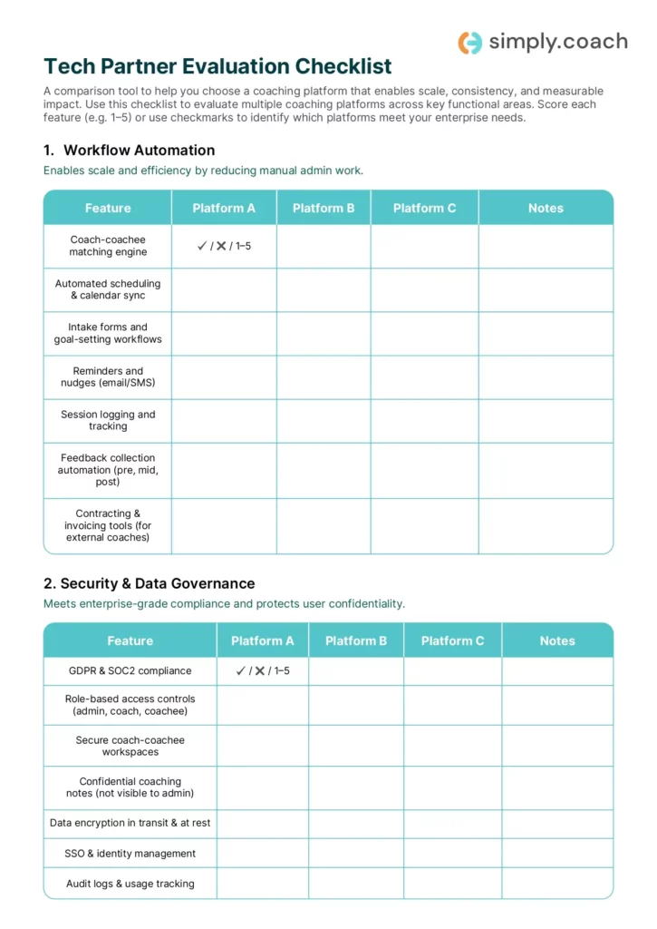 The Tech Partner Evaluation Checklist is a practical tool designed to help both individual coaches and L&D teams make informed decisions when selecting a coaching platform. Whether you’re setting up your first system or scaling an existing program, the checklist guides you through evaluating key areas like scheduling, automation, security, user experience, and reporting. It’s designed to simplify your selection process and help you find a platform that supports coaching at any scale.